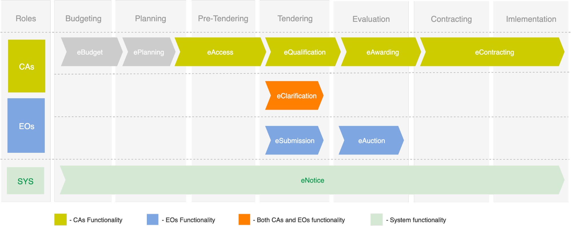 These Components shall automate entire procurement lifecycle (from planning to payment) for different procurement methods described below (see “Coverage” chapter). The following figure contains a generic distinction for management of the public procurement process and the interaction between the CAs, EOs and the system itself: